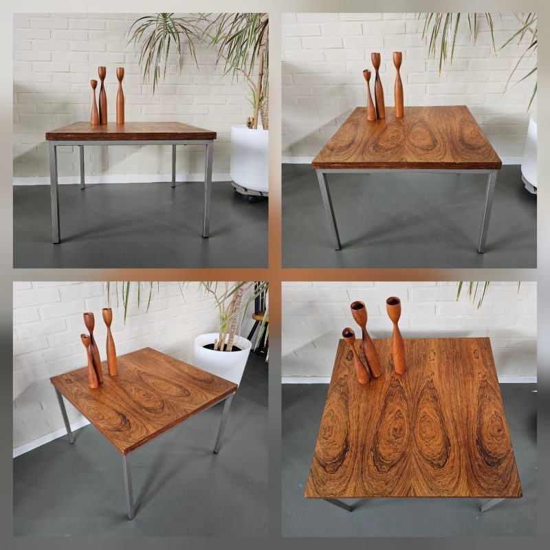 Salontafel / Bijzettafel met pallissander blad en metalen onderstel – mooi strak model en in goede vintage staat – 60x60x41,5cm – € 150