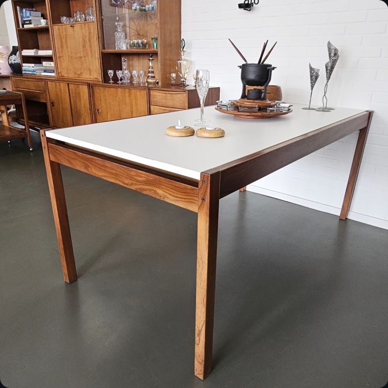 Pastoe Eettafel Cees Braakman jaren 60 – pallissander hout met een wit formica blad – verlengbaar/uitschuifbaar van 165 cm naar 220 cm lang. breedte is 85 cm, hoogte 73 cm. in goede vintage staat met wat lichte sporen van leeftijd – € 365